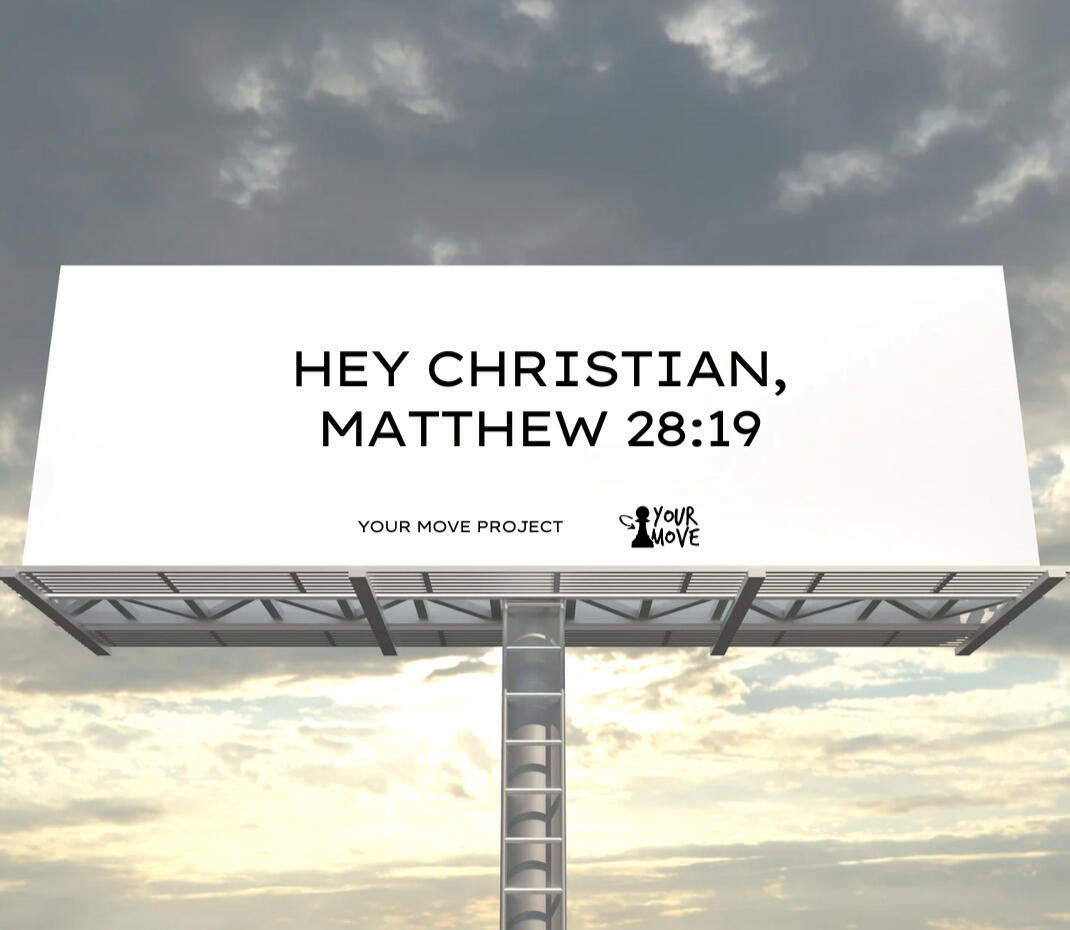 The Your Move Project aims to inspire individuals to take intentional steps closer to Jesus Christ.But How? We reach both believers and non-believers by presenting clear gospel messages, thought-provoking apologetic arguments, and ongoing reminders of Christian commitment. Through impactful messaging displayed in public venues and creative mediums, we encourage everyone to actively pursue a deeper relationship with Jesus and embrace a Christian worldview in their daily lives. Jesus is inviting you to a new life in Him, but it's your move.